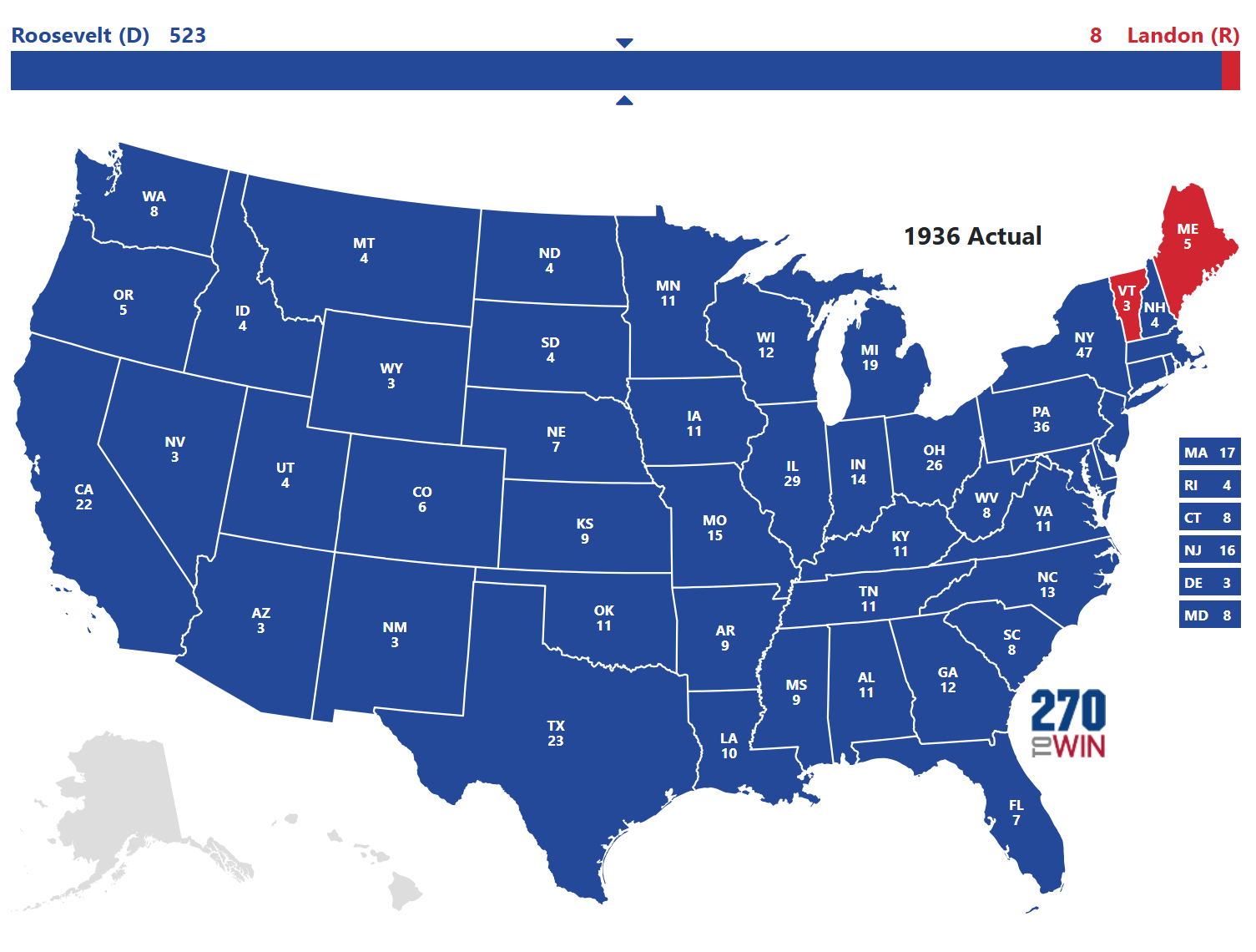 In 1936, Roosevelt won one of the biggest landslides in American history. FDR carried all but two states and won 523 electoral votes compared to challenger Alf Landon’s eight. He then proceeded to win two more landslide elections. While his decision to break the two-term precedent remains controversial to this day, he was not the first to try. He was just the first to succeed, and he did so because the country loved his policies.